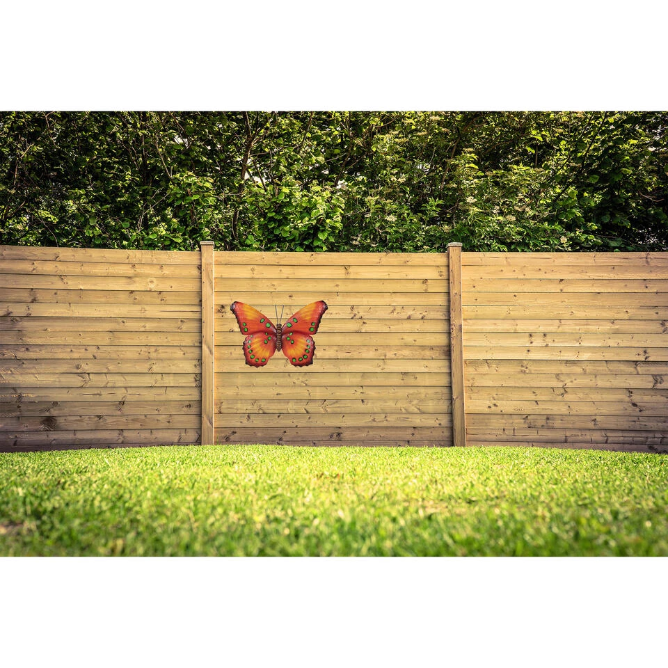 Tuindecoratie vlinder van metaal oranje 37 cm. Deze metalen wanddecoratie vlinder heeft een formaat van ca. 37 x 27 cm. Materiaal: metaal. U kunt de vlinder bevestigen aan de wand/muur of schutting, bevestigingsmateriaal niet inbegrepen.
