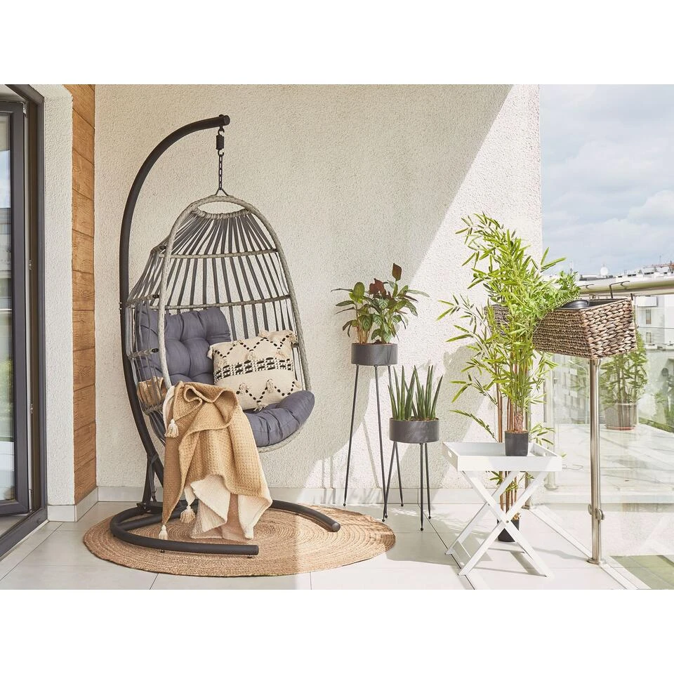 Wicker hangstoel met standaard en zacht donkergrijs kussen. Met zijn licht gebogen frame, zal deze prachtige hangstoel je absoluut comfort bieden. Het stevige metalen onderstel van de hangstoel garandeert maximale stabiliteit. De mand van PE rotan en het zachte zitkussen maken deze schommelstoel tot een comfortabele plek om te ontspannen. Het zitkussen is bovendien beschermd tegen Uv-straling, zodat je zowel binnen als buiten van deze stoel kunt genieten. Deze hangstoel staat bijzonder goed in Boho en modern ingerichte interieurs.