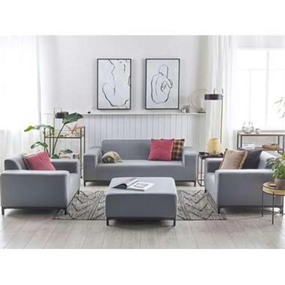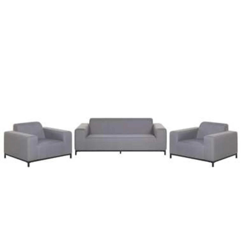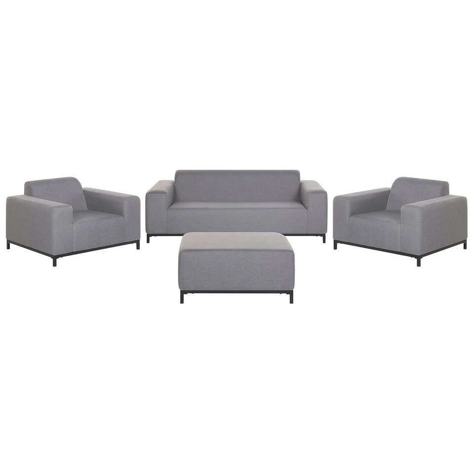 Exclusieve 4-delige loungeset voor binnen en buiten. Deze loungeset bestaat uit een driezitsbank, 2 loungestoelen met armleuningen en een vierkante ottomaan. Het stabiele, zwarte onderstel is gemaakt van gepoedercoat metaal. Deze meubels zijn perfect om het hele jaar door te gebruiken, zowel binnen als buiten. De elegante, grijze bekledingsstof is gemaakt van polyester. Deze tuinset is van binnen opgevuld met een sneldrogend schuim, dat dankzij zijn speciale structuur het water veel sneller laat doorstromen dan zeer elastisch schuim. Het gebruik van ademende materialen zorgt voor een uitstekende luchtcirculatie en bevordert een snelle droging, ook na zware regenval.