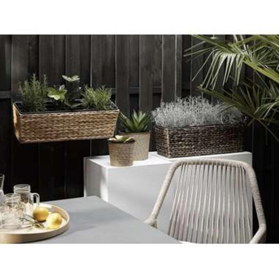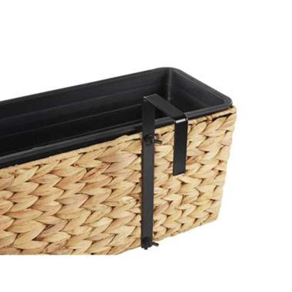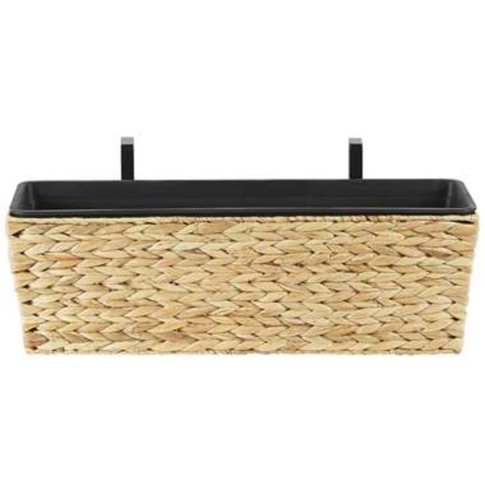 Rechthoekige balkonbak van waterhyacint voor binnen en buiten. Bevestig deze hangende plantenbak aan de buitenkant van je balkonreling om je zitplek te omringen met een zomeroase en te genieten van een groen uitzicht. De bakken zijn uitgerust met twee maatvaste inzetstukken voor beplanting, die de kuip beschermen tegen water en wortelgroei. De handgrepen kunnen indien nodig eenvoudig worden verwijderd, zodat je ze ook in de vensterbank kunt gebruiken. Omdat de bloembak is gemaakt van natuurlijke, gedroogde waterhyacint, is hij UV- en weerbestendig, bijzonder slijtvast, zeer duurzaam en ongedierte- en schimmelbestendig.