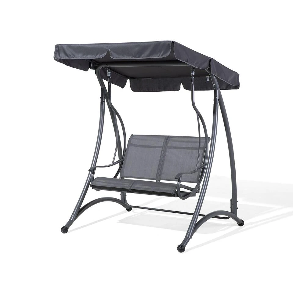 Comfortabele schommelbank in grijs. Deze comfortabele en aantrekkelijke 2-zits tuinschommel biedt een romantisch en comfortabel zitgedeelte voor de buitenruimte. Het geรฏntegreerde, instelbare zonnescherm, gemaakt van grijs, duurzaam polyester, zorgt voor aangename schaduw. De zonnekap is afneembaar en kan op 30ยฐC worden gewassen. Het stevige en gebogen frame van grijs, gepoedercoat staal staat op vier stevige poten en geeft de schommel een moderne uitstraling. Maak het jezelf gemakkelijk op zonnige dagen!