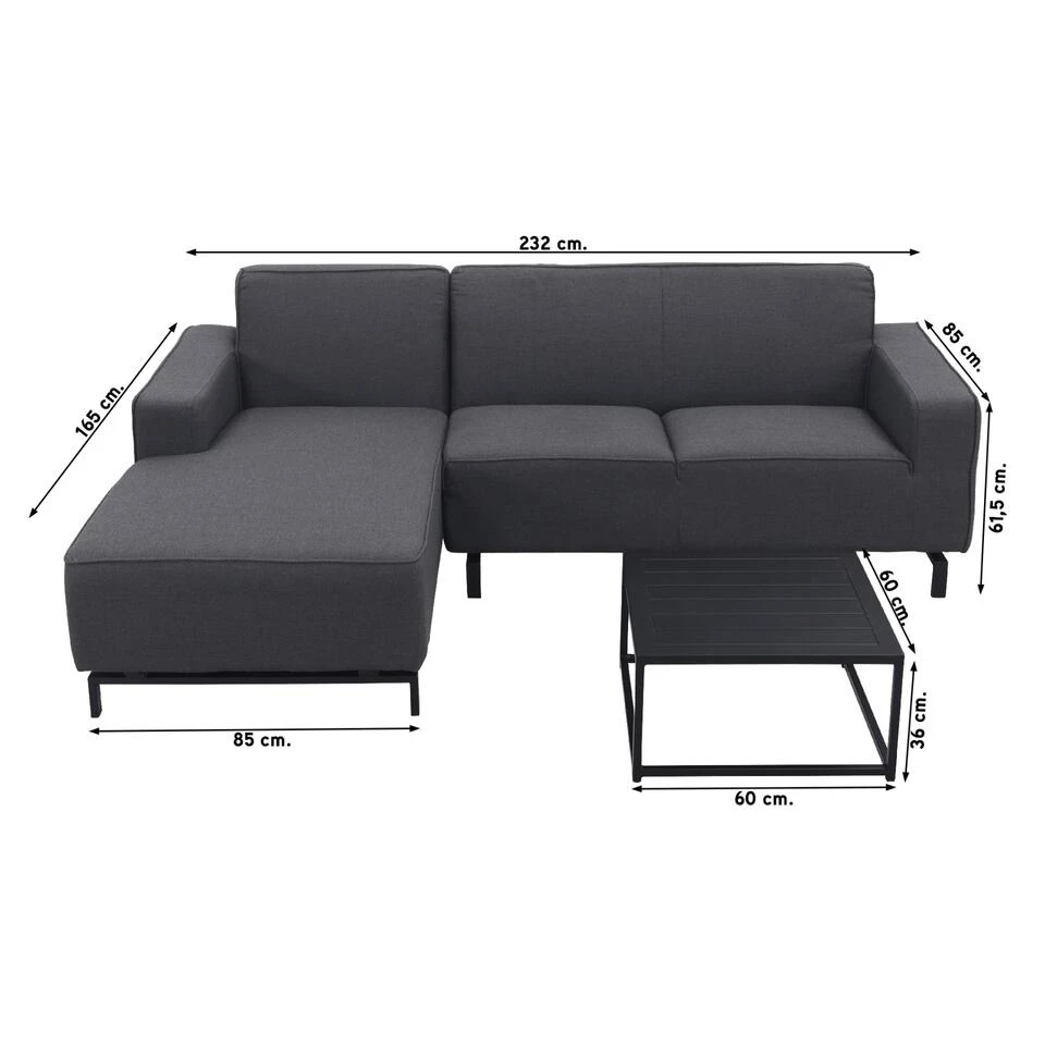 Ontspanning en comfort gaan hand in hand met onze geweldige Boavista/Toronto loungeset. De Boavista loungebank is ontworpen met de beste kwaliteit in gedachten, gemaakt van Sunbrella, een all weather stof die bestand is tegen de meest veeleisende weersomstandigheden. Het antracietkleurige ontwerp past perfect in elke tuin of terras, en biedt voldoende ruimte voor drie personen om comfortabel te zitten. De Toronto bijzettafel is de perfecte aanvulling op de loungebank, gemaakt van hoogwaardig aluminium in een prachtige zwarte kleur. De afmetingen van 60 bij 60 cm zijn perfect voor het plaatsen van drankjes, snacks of boeken terwijl je ontspant in de loungebank. Kies voor onze loungeset en ontdek de perfecte combinatie van stijl, comfort en functionaliteit.ย