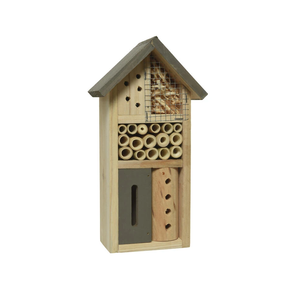 Grijs insectenhotel huisje. Een insecten hotel huisje voor bijen, vlinders, lieveheersbeestjes, kevers, duizendpoten en andere insecten. In dit insectenhotel kunnen de insecten uitrusten/overwinteren. Afmeting: ca. 9 x 13 x 26 cm. Materiaal: vurenhout. Met ophangsysteem. Dit diervriendelijke tuindecoratie accessoires bijenhuis/vlinderhuis insectenhotel draagt bij aan het ecosysteem en de biodiversiteit in uw tuin. Een habitat voor bestuivers en natuurlijke ongediertebestrijders. Een must-have voor tuinliefhebbers/natuurliefhebbers.