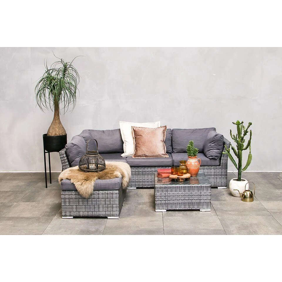 De Palermo Loungeset uit de Fonteyn Collectie heeft een rustige vloeiende vormgeving en is gemaakt van wicker. U kunt deze loungeset naar eigen wens opstellen door de losse elementen. De comfortabele antraciet kussens worden geleverd met gratis extra hoezenset in wit.