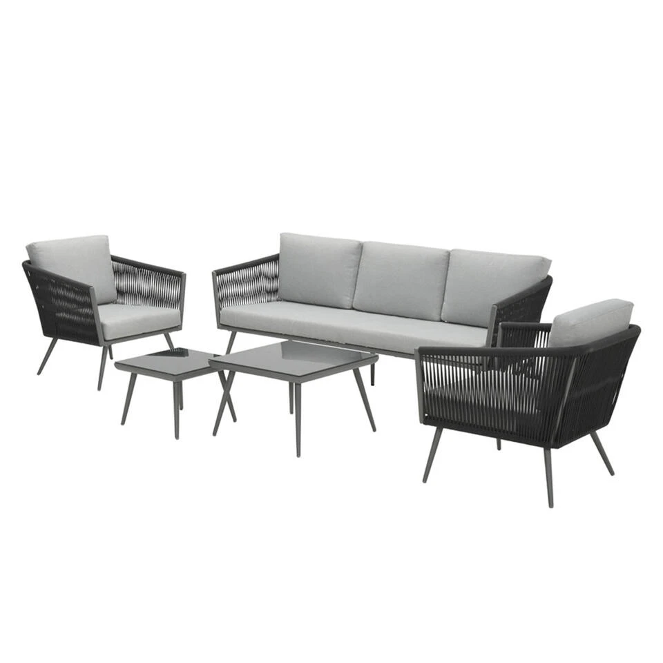 Ben jij op zoek naar een mooie ruime loungeset met losse bank en stoelen? Dan is de Odessa loungeset 5-delig wellicht iets voor jou! De loungeset heeft comfortabele dikke kussens en een diepe zit. De poten van de loungeset heb een conische vorm en zijn voorzien van steldopjes. Het uiterlijk van deze loungeset is erg modern door het gebruik van rope in de afwerking van de set.