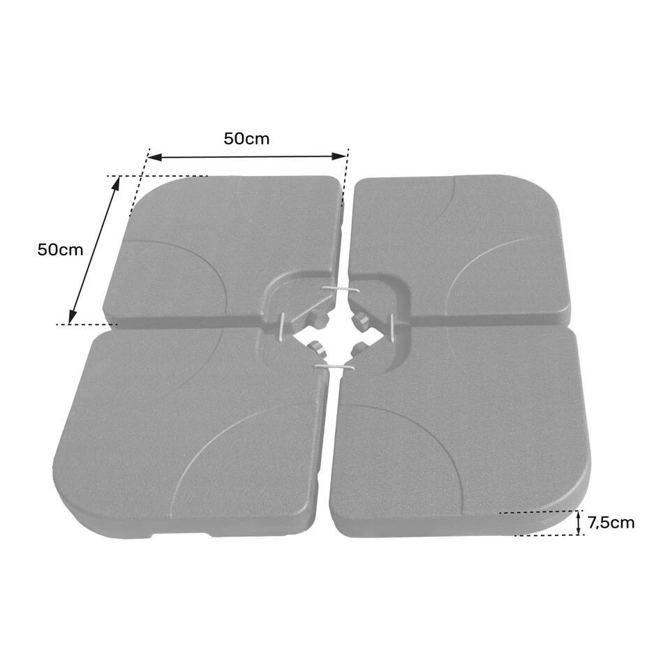 Stormkracht? Geen nood, met QUIBERON ballastplaten (te vullen met water of zand) blijft uw parasol op zijn plaats (denk er wel aan om hem te sluiten).