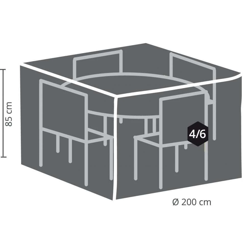 Deze Outdoor Covers hoes van 200 cm is geschikt voor een dining set met een ronde tafel van maximaal ร150 cm, met 4 tot 6 stoelen.