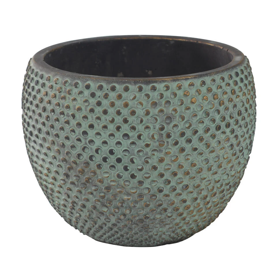 Plantenpot/bloempot stijlvol motief blauw/goud D16 en H12 cm. Uit de Fay cement serie voor binnen gebruik. Handgemaakt in Portugal. Haar stijlvolle vorm en delicate patroon brengen elegantie in het interieur. Ze is robuust en romantisch, lief en eigenwijs. Ze blend in verschillende stijlen maar is ook sterk als eyecatcher. Combineer haar met tropische planten, gekleurde bloemen. Uitstraling alsof het een metalen finish heeft.