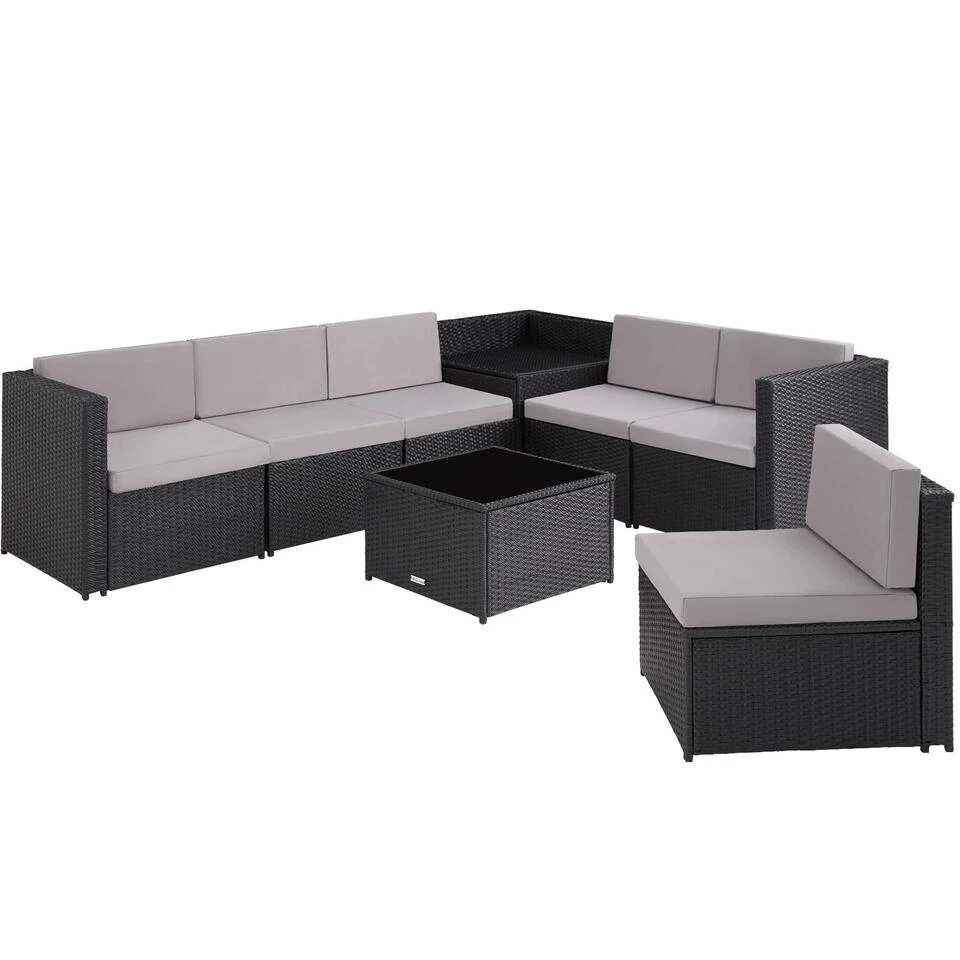 De bijna onbeperkte combinatiemogelijkheden maken van de gezellige wicker loungeset Verona een echte uitdaging voor je creativiteit. Elk van de acht afzonderlijke elementen kan variabel met de rest van de set worden verbonden en kan ook vrijstaand worden gebruikt – afhankelijk van je wensen en ruimte. Het slijtvaste en duurzame wicker is qua kleur perfect afgestemd op de comfortabele zit- en rugkussens. De stevige zitgroep wordt gecompleteerd door een praktische opbergbox en een lage tafel, waarvan het robuuste veiligheidsglas in chique zwart het hele ensemble zijn edele touch geeft.