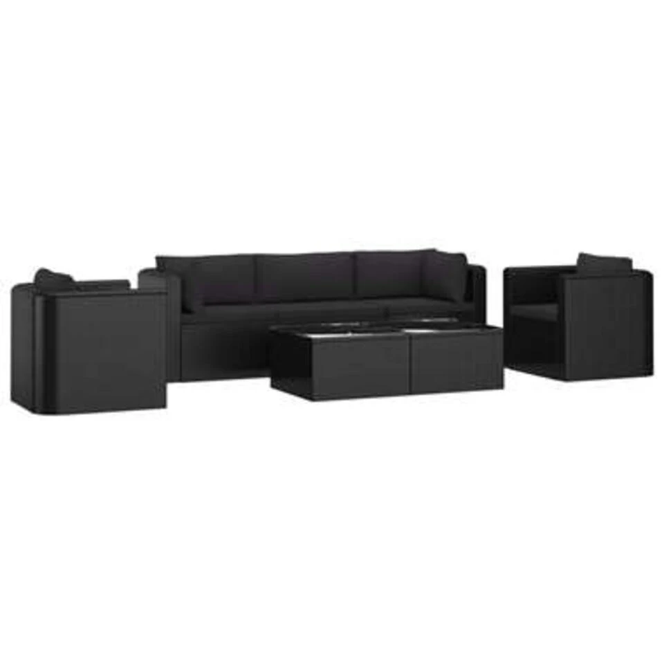 De levering bevat 2 hoekbanken, 1 middenbank, 2 armstoelen, 5 zitkussens, 5 rugkussens en 2 salontafels met glazen bladen. Opmerking: we raden aan om de rattan set af te dekken als het regent, sneeuwt of vriest.